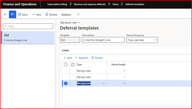 1. Set up a deferral Template. Define straight-line templates within the Deferral Template setup to establish deferral schedules. Template lines differentiate between Recognized and Skipped amounts, offering flexibility in revenue recognition across periods.