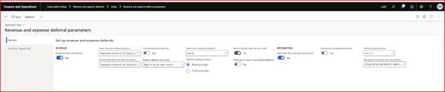 1. Set up Revenue and Expense Deferral parameters. Specify a new number sequence for the Deferral schedule.